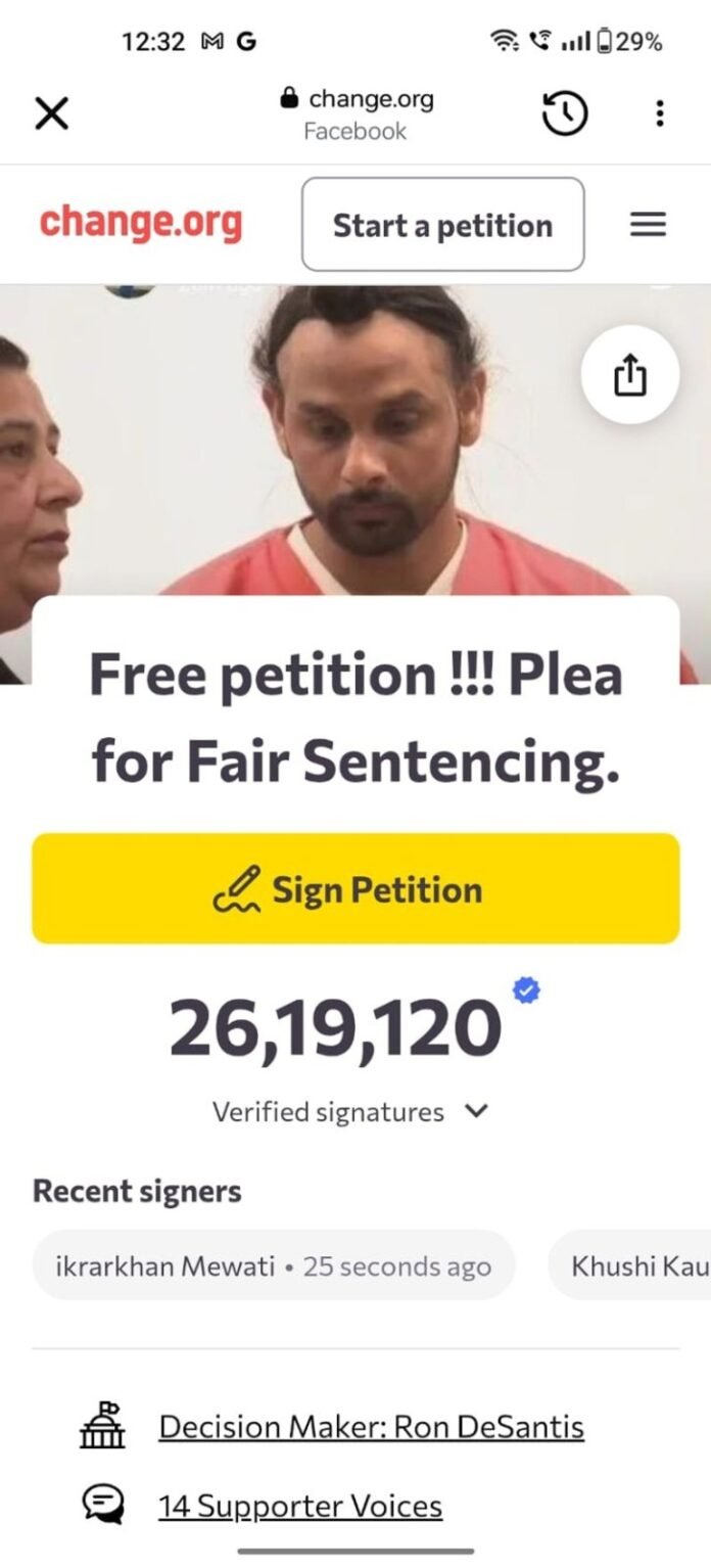 ਫਲੋਰਿਡਾ ਦੇ ਗਵਰਨਰ ਰੋਨ ਡੀਸੈਂਟਿਸ ਨੂੰ ਸੰਬੋਧਿਤ ਕੀਤੀ ਗਈ ਇਸ ਆਨਲਾਈਨ ਪਟੀਸ਼ਨ ਵਿੱਚ ਕਿਹਾ ਗਿਆ ਹੈ ਕਿ ਹਾਦਸਾ ਜਾਣਬੁੱਝ ਕੇ ਨਹੀਂ ਸੀ ਅਤੇ ਸੰਭਾਵਿਤ ਸਜ਼ਾ ਨੂੰ ਅਣਮਨੁੱਖੀ ਕਿਹਾ ਗਿਆ ਹੈ। ਇਸ ਵਿਚ ਸਮਰਥਕ ਅਧਿਕਾਰੀਆਂ ਨੂੰ ਨਰਮੀ, ਪੈਰੋਲ ਦੀ ਯੋਗਤਾ, ਜਾਂ ਕਮਿਊਨਿਟੀ ਸੇਵਾ ਵਰਗੇ ਵਿਕਲਪਾਂ ’ਤੇ ਵਿਚਾਰ ਕਰਨ ਦੀ ਅਪੀਲ ਕਰ ਰਹੇ ਹਨ।