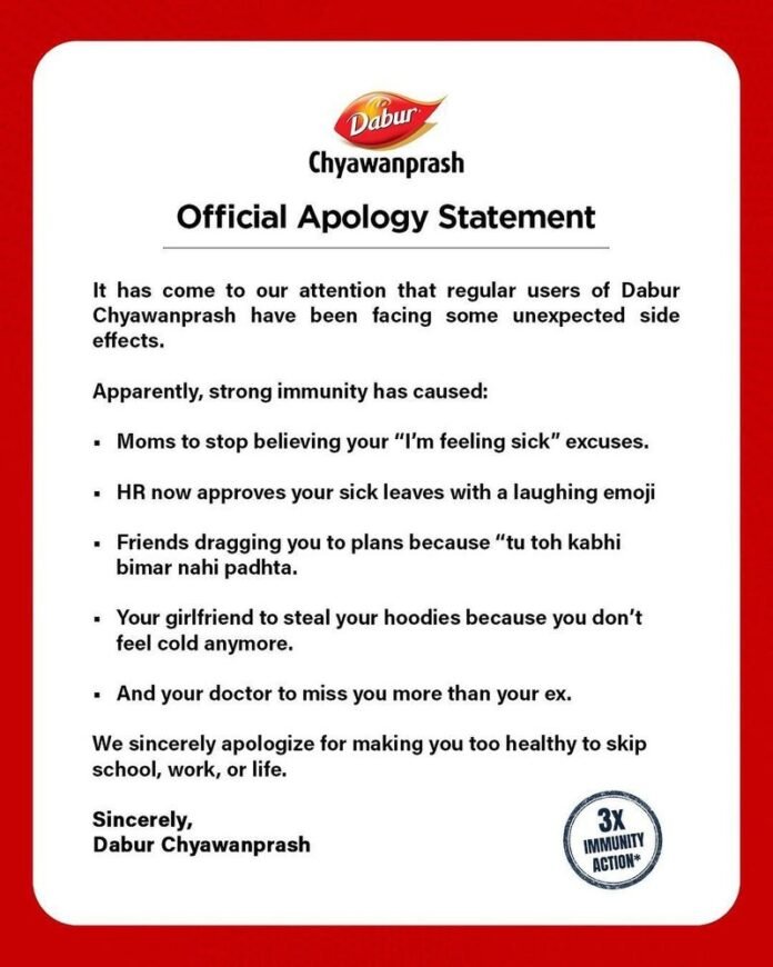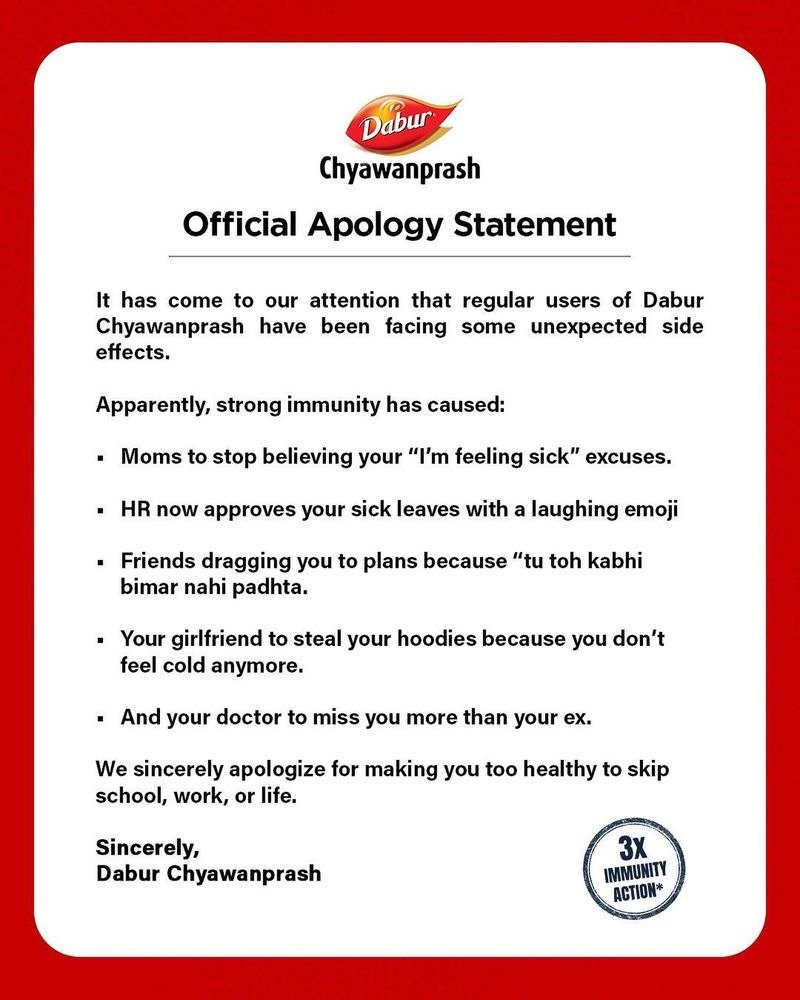 ਡਾਬਰ ਚਵਨਪ੍ਰਾਸ਼ ਕੰਪਨੀ ਨੇ ਆਪਣੇ ਮਾਫੀਨਾਮੇ ਦੇ ਅੰਤ ਵਿੱਚ ਮਜ਼ਾਕੀਆ ਅੰਦਾਜ਼ ਵਿੱਚ ਲਿਖਿਆ ਹੈ, ‘‘ਅਸੀਂ ਤੁਹਾਨੂੰ ਸਕੂਲ, ਕੰਮ ਜਾਂ ਜ਼ਿੰਦਗੀ ਛੱਡਣ ਲਈ ਬਹੁਤ ਜ਼ਿਆਦਾ ਸਿਹਤਮੰਦ ਬਣਾਉਣ ਲਈ ਸੱਚਮੁੱਚ ਮੁਆਫੀ ਮੰਗਦੇ ਹਾਂ।’’ ਇਸ ਦੇ ਨਾਲ ਹੀ, ਉਨ੍ਹਾਂ ਨੇ ਇੱਕ ਵਾਰ ਫਿਰ ਇਹ ਵੀ ਦੱਸ ਦਿੱਤਾ ਹੈ ਕਿ ਉਹ ਆਪਣੀ ਇਹ ਗਲਤੀ ਕਰਦੇ ਰਹਿਣਗੇ।