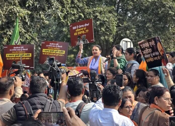 ਭਾਜਪਾ ਮਹਿਲਾ ਮੋਰਚਾ ਦੀ ਸੂਬਾ ਪ੍ਰਧਾਨ ਜੈਇੰਦਰ ਕੌਰ ਨੇ ਕਿਹਾ ਕਿ ਆਮ ਆਦਮੀ ਪਾਰਟੀ ਵੱਲੋਂ ਸਾਲ 2022 ਦੀਆਂ ਵਿਧਾਨ ਸਭਾ ਚੋਣਾਂ ਵਿੱਚ ਔਰਤਾਂ ਨੂੰ ਇੱਕ ਇੱਕ ਹਜਾਰ ਰੁਪਏ ਪ੍ਰਤੀ ਮਹੀਨਾ ਦੇਣ ਦਾ ਵਾਅਦਾ ਕਰਕੇ ਗੁਮਰਾਹ ਕੀਤਾ ਅਤੇ ਵੋਟਾਂ ਹਾਸਲ ਕੀਤੀਆਂ ਸੀ। ਪਰ ਅੱਜ 45 ਮਹੀਨੇ ਬੀਤਣ ਦੇ ਬਾਵਜੂਦ ਔਰਤਾਂ ਨੂੰ ਇੱਕ ਹਜਾਰ ਰੁਪਏ ਪ੍ਰਤੀ ਮਹੀਨਾ ਦੇਣਾ ਸ਼ੁਰੂ ਤੱਕ ਨਹੀਂ ਕੀਤਾ ਗਿਆ ਹੈ। ਉਨ੍ਹਾ ਮੰਗ ਕੀਤੀ ਕਿ ਪੰਜਾਬ ਸਰਕਾਰ ਜਲਦ ਔਰਤਾਂ ਨੂੰ ਇਕ ਹਜ਼ਾਰ ਰੁਪਏ ਪ੍ਰਤੀ ਮਹੀਨਾ ਦੇਣਾ ਸ਼ੁਰੂ ਕਰੇ ਅਤੇ ਇਸ ਦੇ ਨਾਲ ਹੀ ਪਿਛਲੇ 45 ਮਹੀਨਿਆਂ ਦਾ ਬਕਾਇਆ 45 ਹਜਾਰ ਰੁਪਏ ਵੀ ਹਰ ਔਰਤ ਨੂੰ ਜਾਰੀ ਕੀਤਾ ਜਾਵੇ।